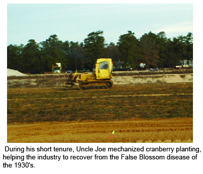 False Blossom, a virus transmitted by an insect pest that wiped out many acres. It was an incurable disease, so efficiencies in replanting was key to success. Uncle Joe came up with the idea to till the ground and take mowings from healthy vines and spread them out over the ground. Then, by attaching a row of vertical discs to the bottom of a bulldozer blade, the vines could be planted very quickly compared to the old method of hand-planting each vine individually. Unfortunately, in 1948 at the age of 31, Uncle Joe was killed in a plane crash on the farm.