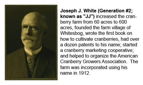 By 1882, when James Fenwick passed, he had full confidence that his son-in-law would run his cranberry farm with integrity. However, he wanted his farm kept separate from JJ’s. That request was honored for the entire lifetime of Fenwick’s widow. When she died in 1911, JJ began the legal process to unite the farms and to incorporate them under the name Joseph J. White, Inc., which was finalized in 1912. He had two major reasons for uniting the farms: (1) the water management system was so interconnected that the lands really needed to be managed as one enterprise, and (2) he did not want the farm physically divided in the future, and incorporating created a “shares” system of ownership.