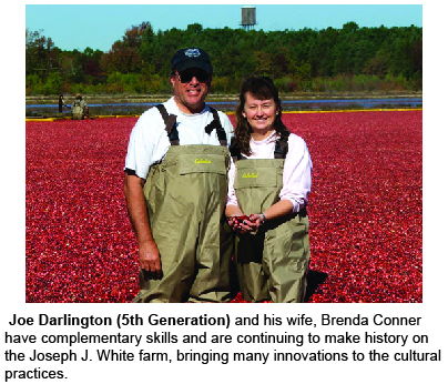 For 2 years the older generation did the best they could to hold things together and the workers kept working. The farm was for sale, but there were no buyers. So in 1950 the workers approached Tom Darlington, Uncle Joe’s younger brother, asking if he would consider leaving his engineering career and take the position of President of Joseph J. White, Inc. Just before harvest of that year, Tom reluctantly packed up his wife and 6-month-old son, Joe (named after his uncle) and moved to the farm. Harvesting cranberries was hard work, required a lot of people, and lasted from the day after Labor Day until the day before Thanksgiving. It didn’t take long before the engineering skills were applied to the farm and by 1952 Tom Darlington invented and patented the first widely-accepted mechanical cranberry harvester. We still use the “Darlington Dry Harvester” to harvest cranberries for the fresh fruit market. He also went on to mechanize blueberry harvesting and several other projects that helped the farm continue to be a leader in the industry. Tom served on the Ocean Spray Board of Directors for 4 decades and become one of the original members of the controversial Pinelands Commission in an effort to represent farming interests. He retired in 1995 and his son, Joe, took over running Joseph J. White, Inc.