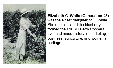JJ and Minnie’s eldest daughter was Elizabeth White. She grew up learning about the cranberry business from her father and had a passionate interest in the growing of the crops. She also loved the wild “swamp huckleberries” that grew in the periphery of her father’s bogs. In 1911 she began a collaboration with Frederick Coville and by 1916 introduced the first commercially cultivated blueberries to the world. She would go on to make history in marketing, business, agriculture, and women’s heritage.